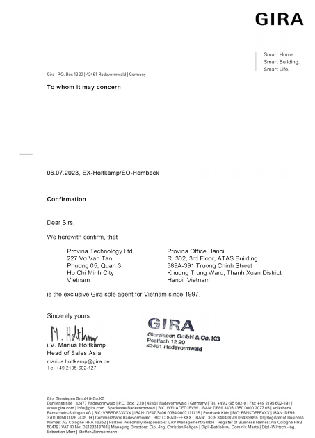 CÔNG TY TNHH THIÊN VIỆT KỸ THUẬT phân phối độc quyền các sản phẩm Gira tại Việt Nam từ 1997.