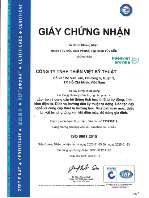 CÔNG TY TNHH THIÊN VIỆT KỸ THUẬT đã áp dụng và đạt ISO 9001:2015 do Tập Đoàn TÜV chứng nhận từ năm 2012.