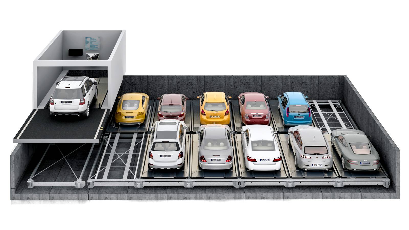 In the fully automated system Levelparker 570 cars are slided and glided closer together in a way like a puzzle.
